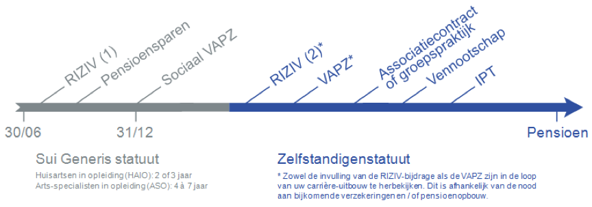 Op het moment dat u uw opleiding hebt afgerond, wordt u waarschijnlijk zelfstandige. Als u ervoor kiest om (gedeeltelijk) geconventioneerd te blijven, dan blijft u jaarlijks (gedeeltelijk) uw RIZIV-bijdrage ontvangen. Toets i.f.v. uw beschikbare mogelijkheden met uw bank af waarvoor u deze bijdrage nu wil gebruiken: pensioenopbouw, een verzekering ‘gewaarborgd inkomen’ of ‘kapitaal bij overlijden’.